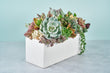 Enhance your event design with our Long White Ceramic Succulent Planter. Bursting with a variety of vibrant succulents, this centerpiece is perfect for medium to large rectangle tables. Complement it with our other white ceramic arrangements for an earth-friendly touch. Our succulents will continue to grow in their pots or can be replanted after the event, a sophisticated alternative to flowers. Use it as a gift or adorn your wedding, baby shower, reception, corporate event, or home. Our arrangements are thoughtfully designed to exude elegance and exclusivity from every vantage point.