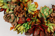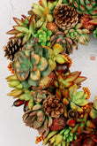 Living succulent wreath trimmed with autumn-fall season color pallet of yellow, orange, red, and green succulent plants for Thanksgiving or Halloween home door decor. Includes natural pine cones, acorns, and sequin-covered glitter acorn accents.