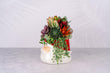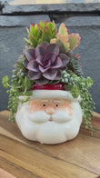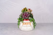 Festive, living succulent arrangement in a ceramic Santa planter. A fun and sustainable Christmas gift or holiday decoration.