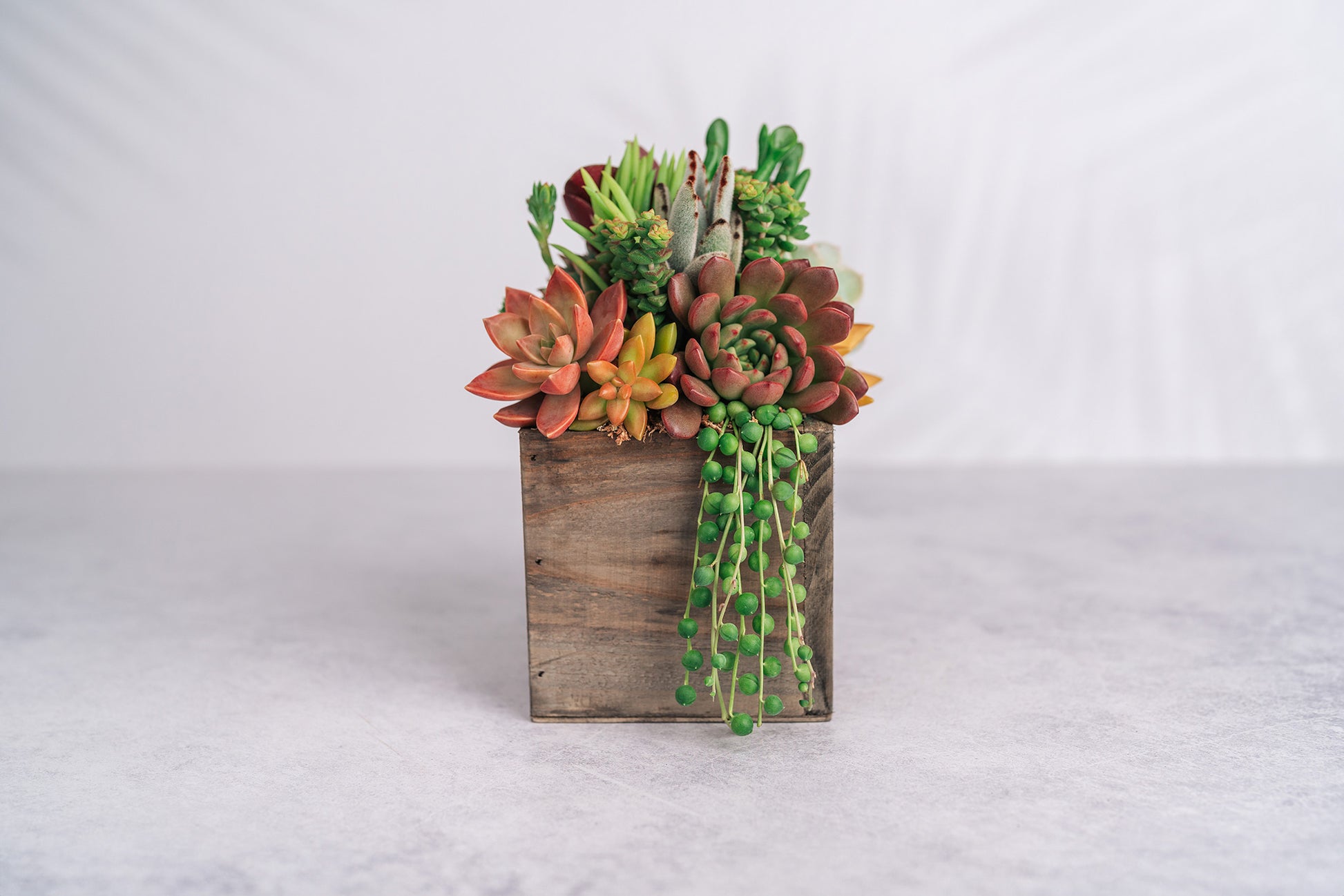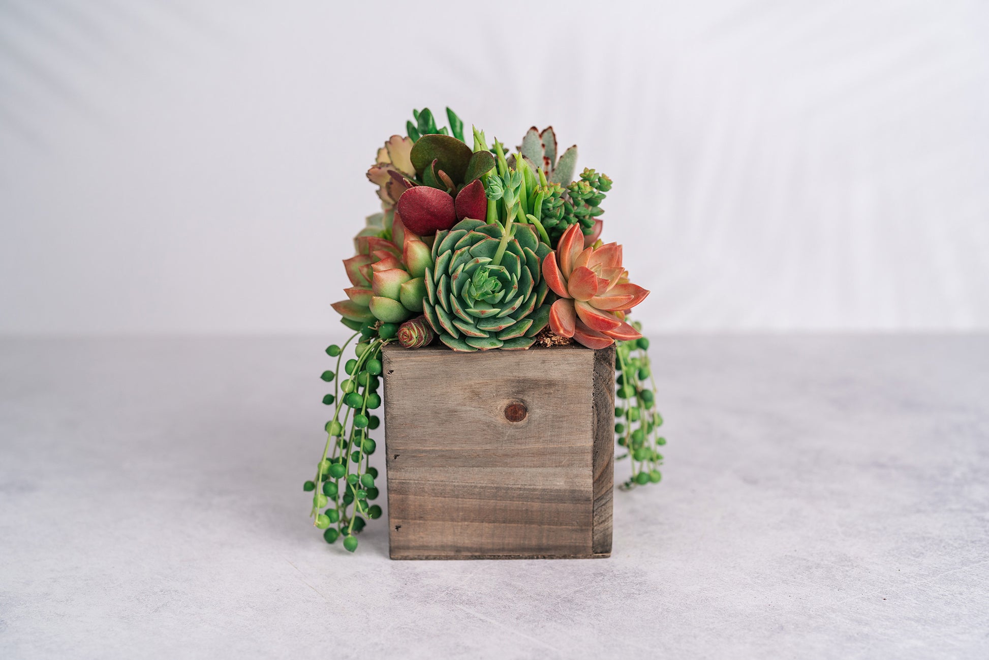 Spread happiness and show your loved ones you care with the perfect gift - a stunning succulent arrangement in your choice of two natural, weathered wood-stained planters. These eco-friendly, low-maintenance plants are sure to brighten anyone's day and make for a thoughtful and unique present. Whether it's for Mother's Day, client appreciation, birthdays, housewarmings, or any other occasion, this gift is sure to bring joy and show your love and appreciation.