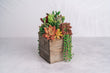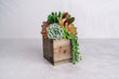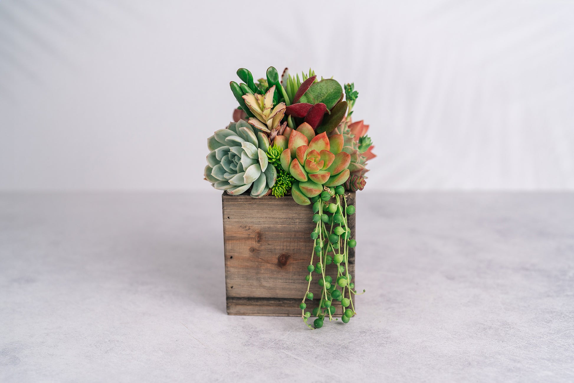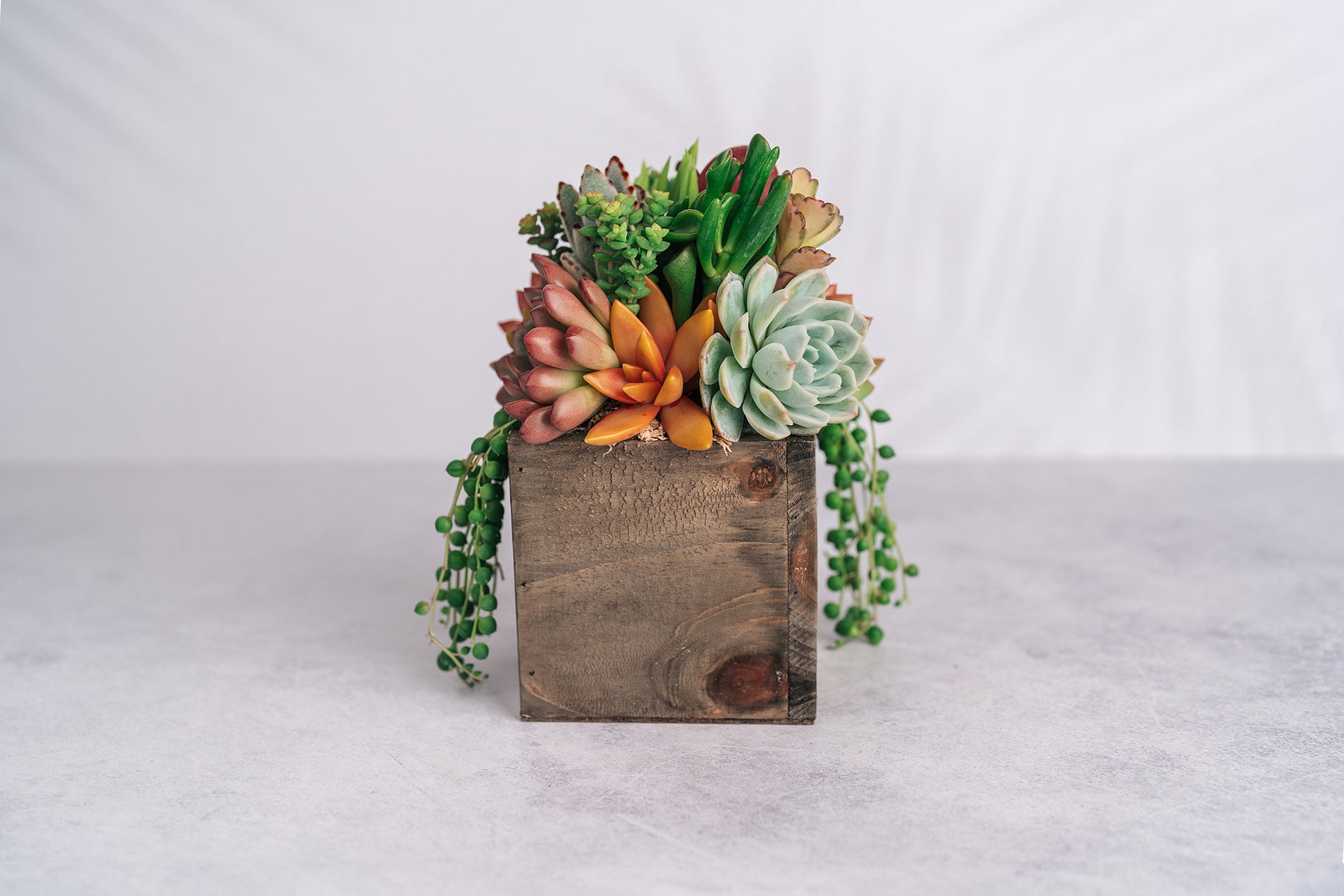PLANTER: Choose either a lightweight wood planter with an unstained whitewash or a weathered brown stain. This planter does not feature a drainage hole, making it a low-effort option for succulent maintenance.