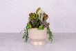 Chic living succulent arrangement in a tan, neutral colored footed ceramic planter.