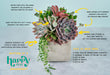 SUCCULENTS: Living succulents are attached to moss-covered floral foam with floral pins. The sphagnum moss will provide your living succulents with the nutrients they need to grow healthily. Each planter is made to order using in-season succulents grown locally in San Diego County. No two will be the same!